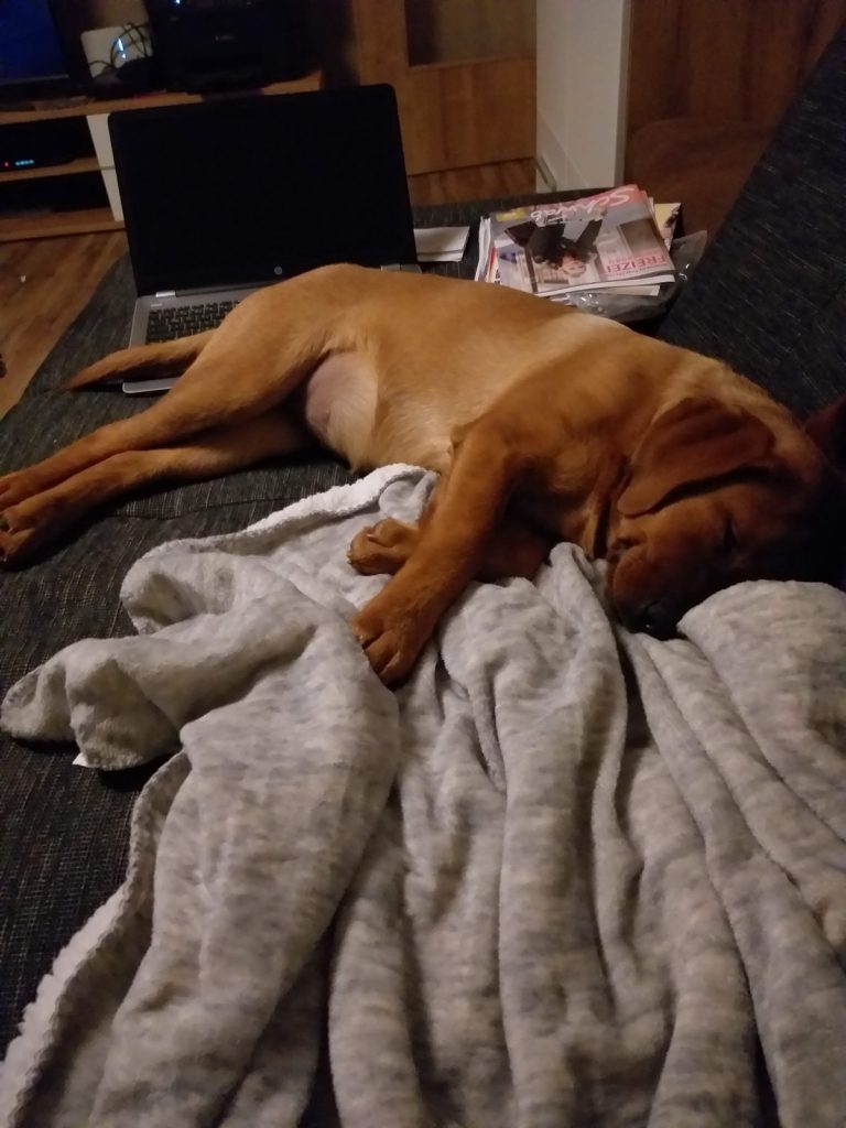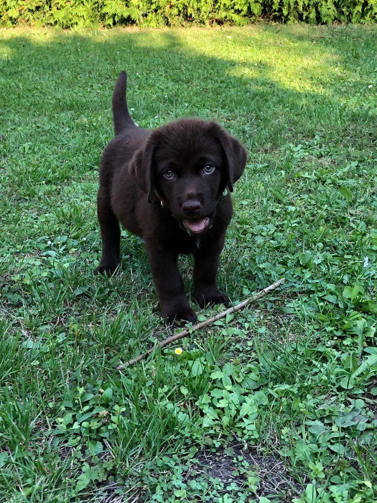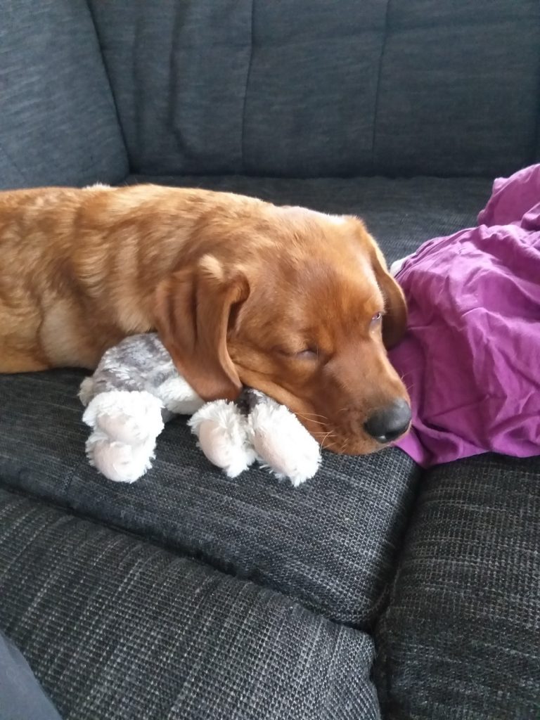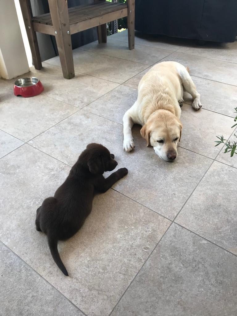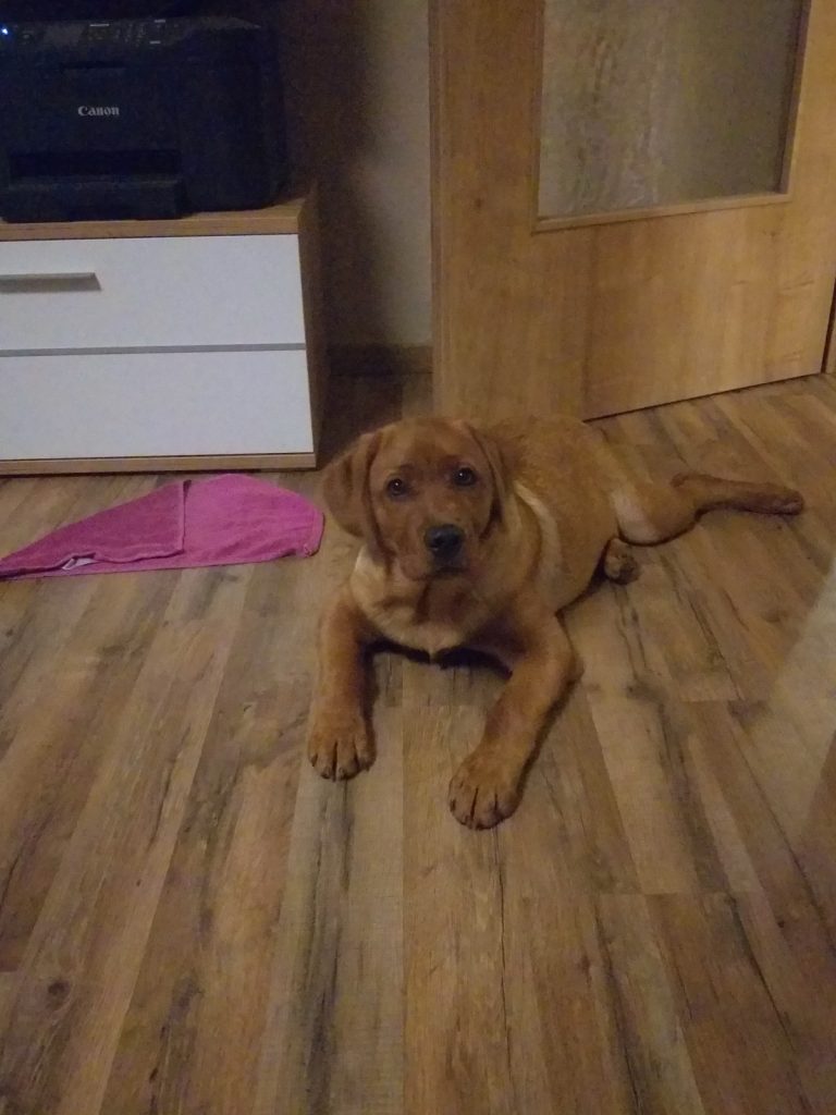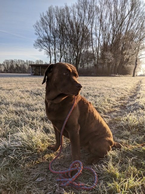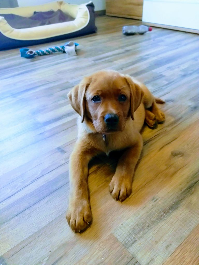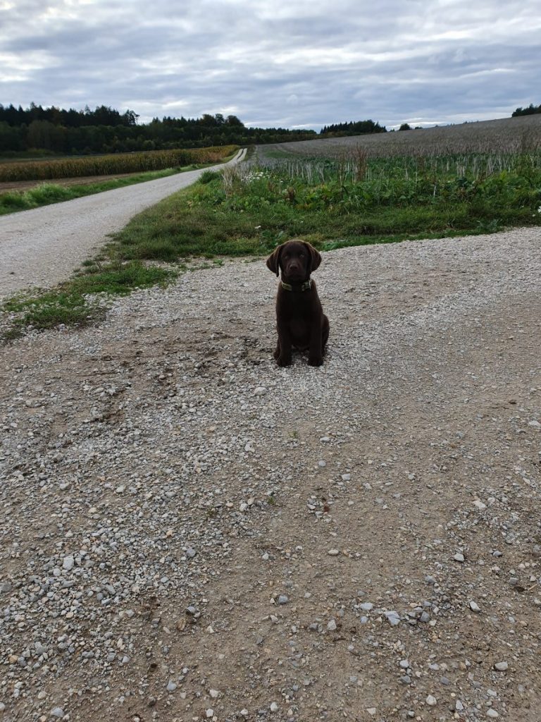 Liebe Tanja, hier mal ein kleines Update von Milow ehemals Max. Milow hat sich sehr schnell an sein neues Zuhause gewöhnt. Ich hatte ihm am Anfang ein Hundebett neben mein Bett gestellt damit er in meiner Nähe ist. Am Anfang fand er den Schuhschrank nachts jedoch bequemer. Jetzt hat er ein Hundetipi damit er seine eigene kleine Höhle hat und er liebt es. Ich habe Milow nach der ersten Woche beim Spazieren gehen abgeleint, da wie zuvor im Garten das Abrufen geübt hatten und es immer geklappt hat. Seitdem läuft er nur an der Leine wenn wir an der Straße gehen. Das Abrufen funktioniert bei ihm super und ich hoffe das bleibt auch so. Egal welche Ablenkung er hat sobald ich ihn rufe kommt er angerannt. Auch Sitz, Platz und Pfötchen kann er mittlerweile. Ich muss sagen er lernt ziemlich schnell. Seit dieser Woche bringt er auch den Snackdummy wenn ich ihm diesen werfe. Vor vier Wochen war ich das erste Mal mit ihm in der Welpenschule und gehe seitdem jeden Samstag mit ihm dort hin. Und ich würde sagen, dass er gerne dort hin geht. Bis jetzt versteht er sich sehr gut mit anderen Hunden und möchte immer mit jedem spielen. Auch mit unserem 8-jährigen Labrador versteht er sich mittlerweile. Am Anfang war unser Großer über den Nachwuchs nicht so begeistert, da er nicht mehr die alleinige Aufmerksamkeit hatte. Doch nach wenigen Tagen hat sich das gelegt und seitdem spielen die beiden jeden Tag miteinander und gehen regelmäßig zusammen spazieren. Ich habe Milow von Anfang an überall mit hingenommen. So konnte er sich gleich an viele Sachen gewöhnen. Ich habe mit ihm auch bereits ein Behindertenwohnheim besucht. Die Bewohner haben sich sehr über ihn gefreut und er auch über sie. Milow ist von seinem Charakter sehr einfühlsam, ruhig und verkuschelt. Ich habe das Gefühl, dass er merkt wenn es mir mal nicht gut geht und dann noch verkuschelter ist oder mir Spielsachen bringt um mich abzulenken. Und das schafft er auch meistens. Milow schläft am liebsten auf oder an mir, was immer schwerer wird weil er immer größer wird. Aktuell schläft er ca. 9 Stunden nachts durch. Ich gehe meistens um zehn nochmal mit ihm raus und dann weckt er mich gegen sieben, weil er sein Fressen möchte. Danach ist es tagesabhängig ob er wachbleibt oder sich nochmal hinlegt und schläft. Zum Schluss möchte ich sagen, dass ich wirklich sehr froh bin den kleinen bei dir gekauft zu haben! Liebe Grüße und bis bald Cara Schlör